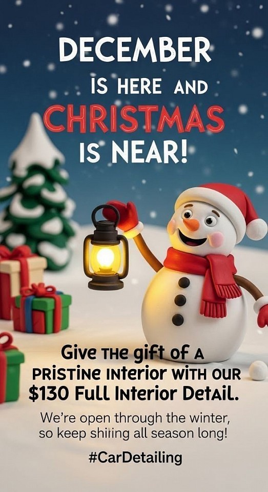 🎁 December’s arrived and Christmas is just around the corner! Treat someone to a sparkling clean interior with our $130 full interior detail. 🎄 We’re open all winter, so keep your ride looking great all season! 🚗❄️ #CarDetailing #HolidayGift #WinterClean