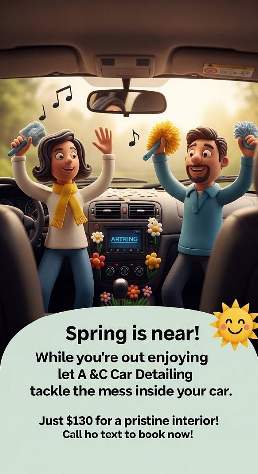 🌟 Spring’s almost here! While you’re soaking up the lovely weather, let A & C Car Detailing handle the mess inside your car. Only $130 for a spotless interior! 🚗✨ Give us a call or text to book today! #SpringDrive #CarDetailing #FreshStarts What’s your favorite spring cleaning tip?