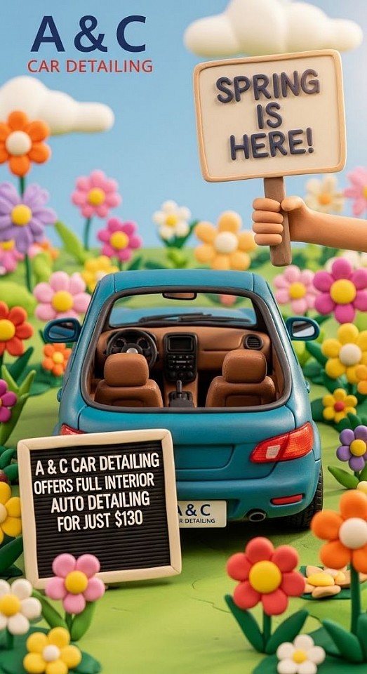 🌸 Spring has arrived, and we're excited to brighten up your day! A & C Car Detailing is offering complete interior auto detailing for only $130. ✨ Grab your spot now and give your car the fresh look it deserves! 🚗🧼 #SpringClean #CarDetailing #FreshRide